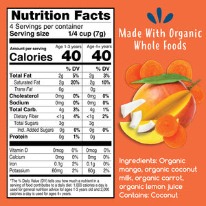 Mango Carrots: Organic mango, organic coconut milk, organic carrots, organic lemon juice
