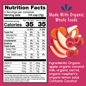 Carrot Raspberry: Organic apple, organic coconut milk, organic carrots (with organic lemon juice), organic raspberries
