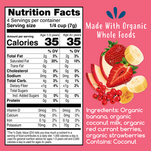 Mixed Red Berries: Organic banana, organic apple, organic coconut milk, organic red currant berries, organic strawberries
