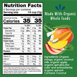 Mighty Sweet Greens: Organic mango, organic apple, organic coconut milk, organic spinach, organic spirulina