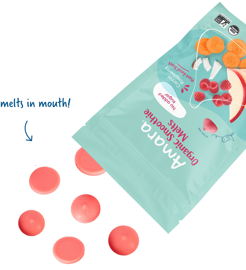 Every baby is different, but on average many are ready to try Amara smoothie melts around 10 months of age. It’s important that your baby can sit independently, pick up and eat finger foods on their own, and chew/mash food well in their mouths before offering smoothie melts. The product is carefully designed to melt in the mouth, but we always recommend careful supervision when feeding snacks and meals.