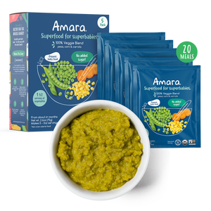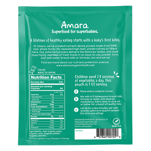 Amara’s designed with your baby in mind. Customized for your baby’s development - just mix with breastmilk, formula or water to the consistency that’s right for your baby. Our proprietary NPT technology removes water from whole foods to ensure shelf stability — strange as it may seem, our powder baby food is more fresh, more nutrient-dense, and more flavorful than traditional baby foods. It’s easy to prepare, easy to store, and requires 12x less packaging!