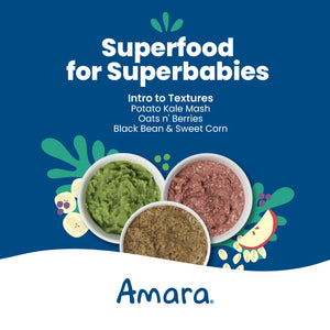 Amara’s designed with your baby in mind. Customized for your baby’s development - just mix with breastmilk, formula or water to the consistency that’s right for your baby. Our proprietary NPT technology removes water from whole foods to ensure shelf stability — strange as it may seem, our powder baby food is more fresh, more nutrient-dense, and more flavorful than traditional baby foods. It’s easy to prepare, easy to store, and requires 12x less packaging!