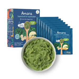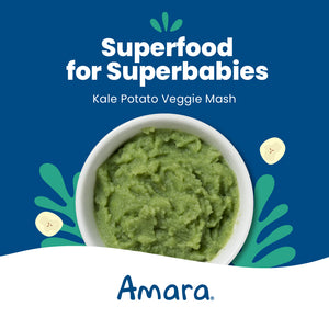 Amara’s designed with your baby in mind. Customized for your baby’s development - just mix with breastmilk, formula or water to the consistency that’s right for your baby. Our proprietary NPT technology removes water from whole foods to ensure shelf stability — strange as it may seem, our powder baby food is more fresh, more nutrient-dense, and more flavorful than traditional baby foods. It’s easy to prepare, easy to store, and requires 12x less packaging!