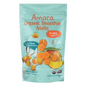 Every baby is different, but on average many are ready to try Amara smoothie melts around 10 months of age. It’s important that your baby can sit independently, pick up and eat finger foods on their own, and chew/mash food well in their mouths before offering smoothie melts. The product is carefully designed to melt in the mouth, but we always recommend careful supervision when feeding snacks and meals.